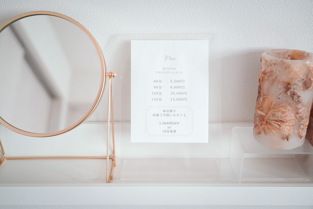 私が癒しを求めていた時、Instagramで目にとまったのが「ほんじつの癒し」でした。白を基調とした落ち着いた内装と、もともと好きだったアロマの世界観に惹かれ、自然と定期的に足を運ぶようになっています。