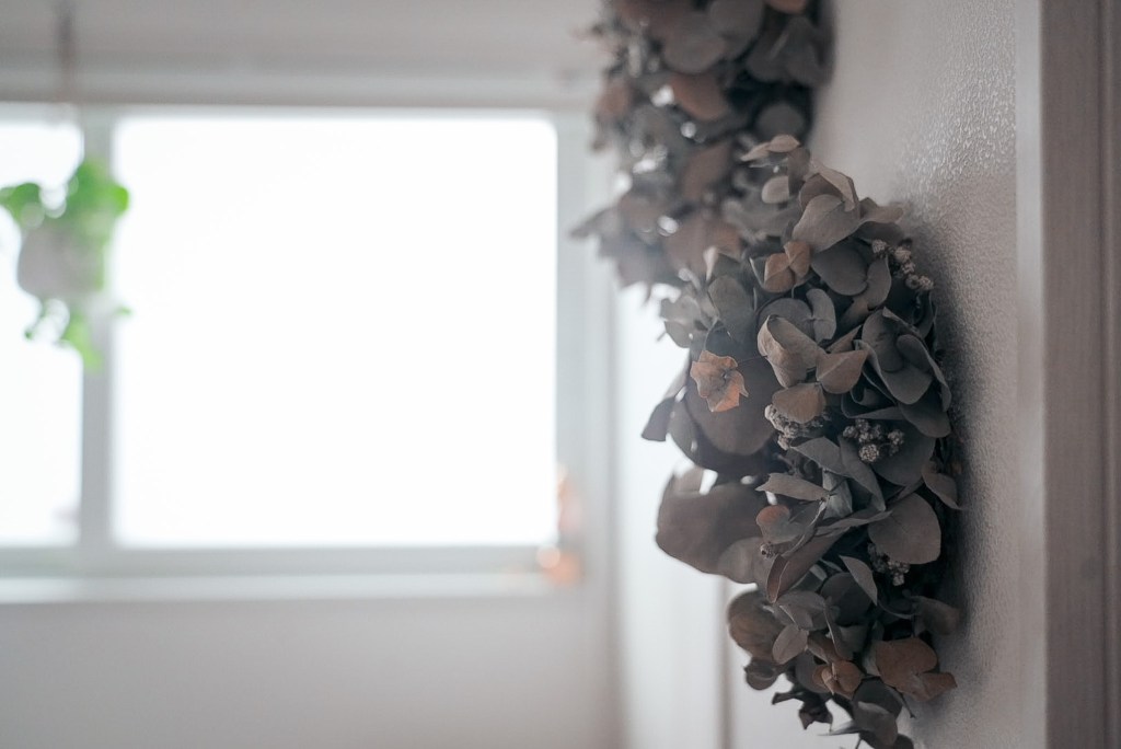 柔らかな光が差し込む部屋の椅子に腰をかけると、観葉植物や吉田さんのお気に入りの作家さんたちによるリースやキャンドルが優しく出迎えてくれます。